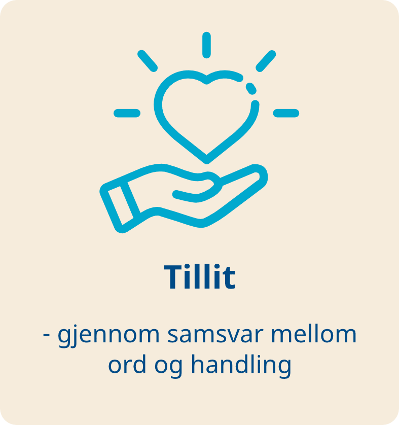 Tillit er ikke noe som kan tas for gitt, men noe som må fortjenes. Vi forstår at tillit er avgjørende både internt og eksternt, og vi arbeider kontinuerlig for å bygge og opprettholde den. Å være åpen og transparent er essensielt for å skape tillit, og vi legger vekt på å skape trygghet blant våre ansatte ved å være tydelige og tilgjengelige som arbeidsgiver. Vår kultur tar tak i mistillit, rykter og uenigheter ved å oppmuntre til åpen dialog og konstruktiv kommunikasjon. Vi overholder strenge personvernregler og prinsippet om integritet, ved å handle i tråd med våre ord. Vår kompetanse, både faglig og mellommenneskelig, er en kilde til tillit, og vi opprettholder konsistent og forutsigbar opptreden for å bygge tillit over tid. Vi er lojale mot hverandre, støtter hverandre og handler ærlig og sannferdig i alle situasjoner. Gjennom disse prinsippene legger vi grunnlaget for et tillitsfullt og bærekraftig arbeidsmiljø.
